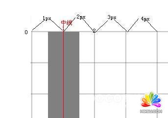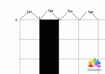 但遺憾的是canvas的線條畫法不一樣,上一篇文章我們已經(jīng)說了,canvas的每條線都有一條無限細(xì)的“中線”,線條的寬度是從中線向兩側(cè)延伸的。如果我們還是從第2個(gè)像素點(diǎn)畫一條線,那么線條的中線就會(huì)靠齊到第2個(gè)像素的起點(diǎn),然后我們開始畫了,問題也就來了:Canvas 的線條以中線向兩側(cè)延伸,而不是向某一邊延伸(比如這里,如果只是往右側(cè)延伸,那么我們的問題就不再是問題了),延伸過后我們的線條實(shí)際上是這樣的: