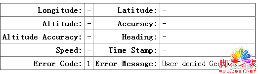 現(xiàn)在我們介紹getCurrentPosition的異常處理,他是通過使用errorCallback回調(diào)函數(shù)實(shí)現(xiàn)的。函數(shù)返回的參數(shù)error包含兩個(gè)屬性,code:錯(cuò)誤類型的代碼;message:錯(cuò)誤信息。code包含三個(gè)值:1:用戶沒有授權(quán)使用geolocation;2:無法獲取坐標(biāo)信息;3:獲取信息超時(shí)。