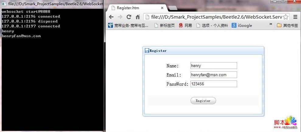 下面通過一個(gè)簡(jiǎn)單的用戶注冊(cè)來體現(xiàn)html5用josn和websocket進(jìn)行交互的處理過程.由于經(jīng)過封裝處理所以使用起來非常方便.