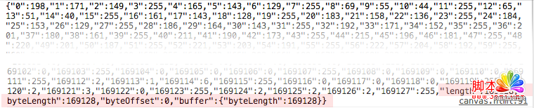然后再將imageData.data的具體內(nèi)容打印出來,內(nèi)容較長,僅截取最前面以及最后面的一段,可以看出: