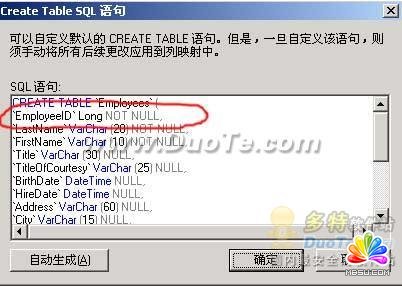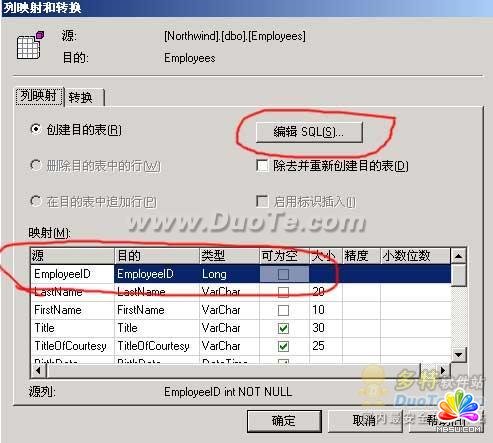 6.我們回看到一個“列映射和轉換”對話框。有注意到自增的employeeid int 自增這里變成了Access里的long這肯定不對,long并不是自動編號,只好修改建表腳本,圖片上那個紅圈里的按鈕“編輯SQL”。