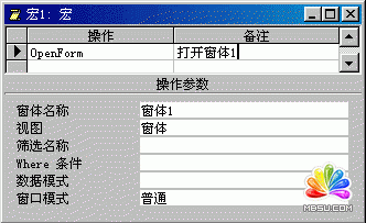 在操作列選擇“OpenForm”,下面參數(shù)中的“窗體名稱(chēng)”選擇“窗體1”(當(dāng)然,在這之前你需要有一個(gè)叫做窗體1的窗體)。