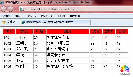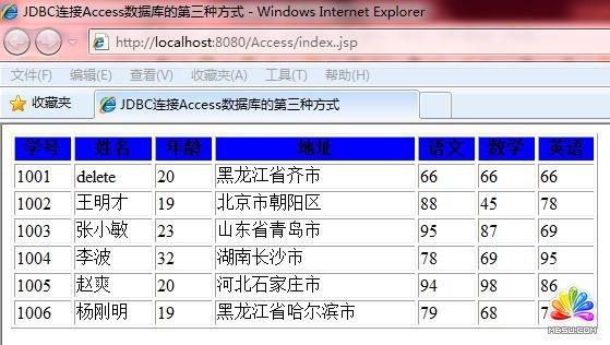 <%@ page language="java" import="java.util.*,java.sql.*" contentType="text/html; charset=UTF-8" pageEncoding="UTF-8"%><!DOCTYPE html PUBLIC "-//W3C//DTD HTML 4.01 Transitional//EN" "http://www.w3.org/TR/html4/loose.dtd"><html> <head> <title>JDBC連接Access數(shù)據(jù)庫的第三種方式</title> </head> <body> <table border="1" width="40%"> <tr bgcolor="blue"> <th>學(xué)號</th> <th>姓名</th> <th>年齡</th> <th>地址</th> <th>語文</th> <th>數(shù)學(xué)</th> <th>英語</th> </tr> <% String path = application.getRealPath("/index.jsp"); path = path.substring(0,path.lastIndexOf("\\"))+"\\"; Class.forName("sun.jdbc.odbc.JdbcOdbcDriver"); String url = "jdbc:odbc:driver={Microsoft Access Driver (*.mdb)};DBQ="+path+"student.mdb "; Connection con = DriverManager.getConnection(url); Statement st = con.createStatement(); String sql = "select * from basic"; ResultSet rs = st.executeQuery(sql); while(rs.next()) { %> <tr> <td><%=rs.getString(1) %></td> <td><%=rs.getString(2) %></td> <td><%=rs.getInt(3) %></td> <td><%=rs.getString(4) %></td> <td><%=rs.getInt(5) %></td> <td><%=rs.getInt(6) %></td> <td><%=rs.getInt(7) %></td> </tr> <% } rs.close(); st.close(); con.close(); %> </table> </body></html>運(yùn)行JSP結(jié)果如下所示:
