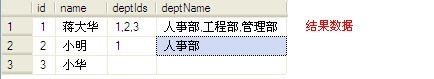 - --此時已將員工表所存的IDS分別與部門相關聯,下面需要將此集合中的deptName聚合成一個記錄