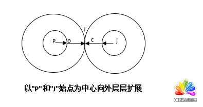 針對第1種方法的改進,就是采用多源點方法,這里就是以節(jié)點"p"和節(jié)點"j"為中心向外層擴展,直到兩圓外切點,如圖4. :
