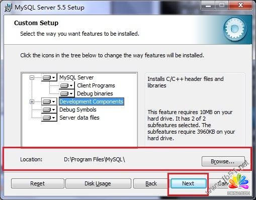 4、在出現自定義安裝界面中選擇mysql數據庫的安裝路徑,這里我設置的是“d:\Program File\MySQL”,單擊“next”繼續安裝,如圖所示: