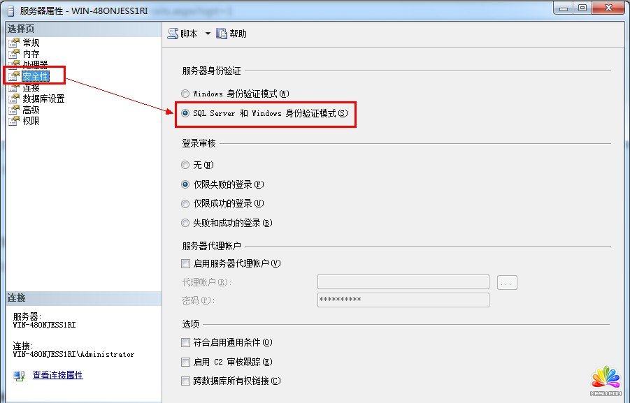 (1: 打開SSMS,用windows身份連接數(shù)據(jù)庫,登錄后,右鍵選擇“屬性”