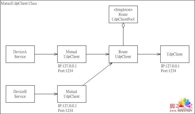 套用Singleton Pool模式解決了共享UdpClient聯機的功能,接著在MutualUdpClient這個解決方案中,為了共享遠程設備傳送的數據封包,在UdpClient與MutualUdpClient之間加入了一個RouteUdpClient對象。
