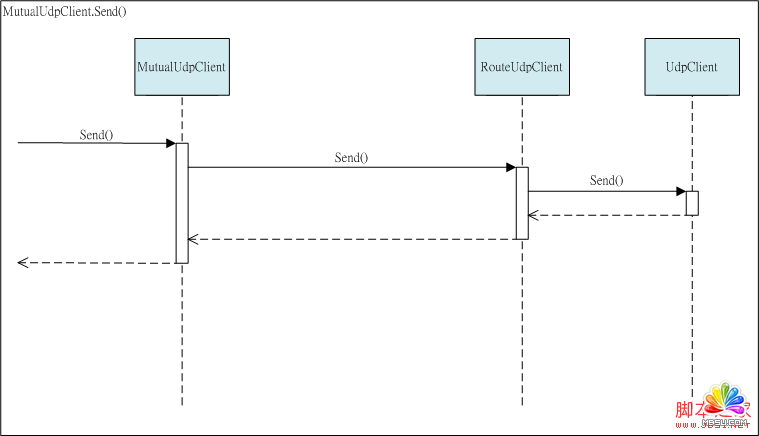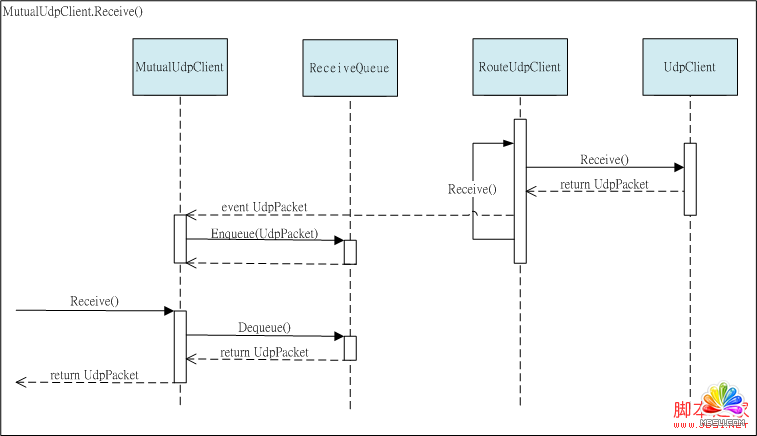而MutualUdpClient對象在收到RouteUdpClient所提供的數據封包時,會先將數據封包暫存在一個隊列里,并且在MutualUdpClient對象的Receive方法被呼叫時,再從隊列取出數據封包并且回傳給呼叫端,用以將遠程設備傳送的數據封包提供給呼叫端做后續的處理。經由這樣的方式,每個系統中所建立的MutualUdpClient對象就可以透過Receive方法取得,每個遠程設備傳送的數據封包。