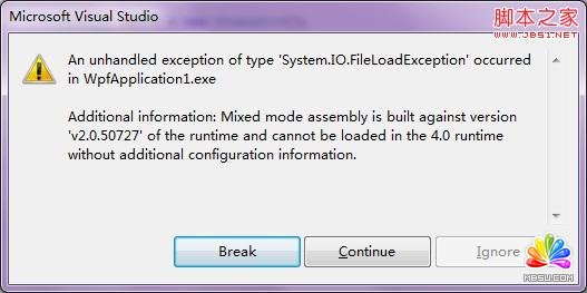 最近部門的開發(fā)環(huán)境都更新到了WIN7+.NET framework4+VS2010上,在體驗新技術(shù)和新環(huán)境帶給我們提高效率的方式方法的同時也帶來了一些兼容性的問題;這幾天項目閑暇時在研究SQLite,在做實驗的時候碰到個問題,代碼編譯通過執(zhí)行時反復異常中斷,查到后面原來是SQLite.dll是在framework2.0環(huán)境下編譯的而現(xiàn)在的運行環(huán)境是framework4.0,所以就出現(xiàn)了運行異常,如圖: