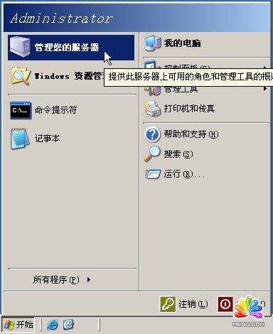 打開“開始”菜單,點擊“管理您的服務器”(如圖1所示),點擊“添加或刪除角色”(如圖2所示)。