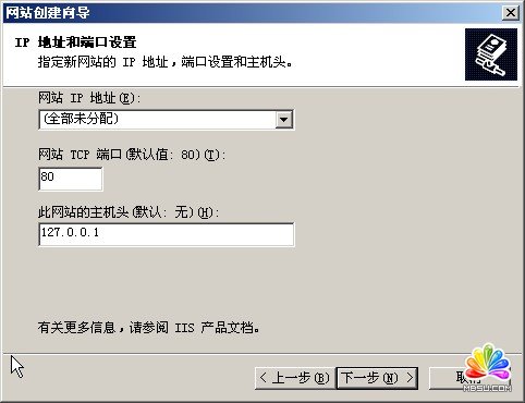 進入向導后,進入下一步,為網站添加描述,也就是IIS中顯示的網站標示,可以隨便填寫,再進入下一步,為網站配置主機頭,我們是用來配置本地測試環境,所以把主機頭配置為127.0.0.1(如圖6所示)