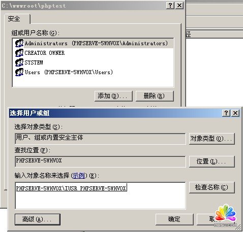 下面要為目錄配置權限,首先先在網站名稱上點擊右鍵,進入“權限”選項,進入“權限”之后點擊“添加”按鈕,點擊“高級”,然后點擊“立即查找”,找到IUSR_%計算機名%,選擇之后點擊確定,此時回到了權限選項的位置,除了“完全控制”和“特殊權限”之外全部勾選,最后點擊“應用”。權限配置好后,在目錄中新建一個index.html文件,隨意輸入一些文字或者html代碼即可。