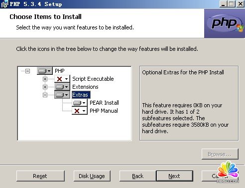 下一步需要配置安裝選項,這里我們除了默認的選項之外增加了pear install(圖9所示)
