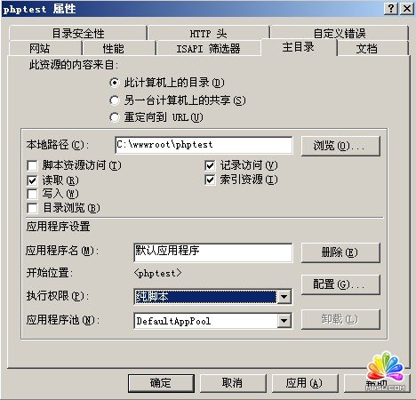 首先打開IIS管理器,然后在先前測試IIS的網站上右鍵,進入“屬性”,點擊主目錄選項卡,然后將“執行權限”配置為“純腳本”,如圖10所示