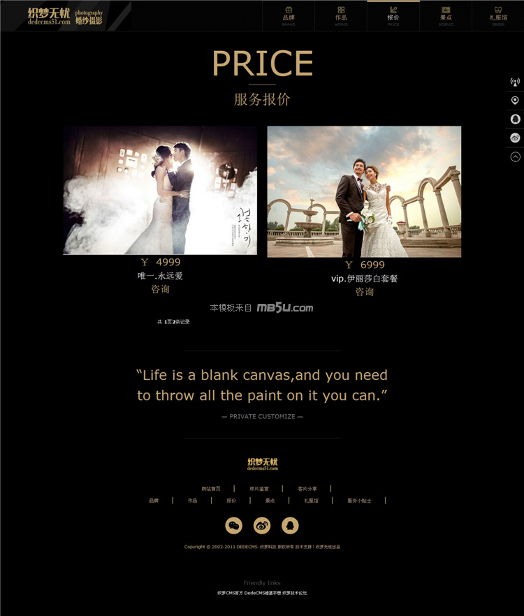私人訂制婚紗攝影模板,適合婚紗,攝影,旅游行業使用,測試完整無錯,兼容所有主流瀏覽器。