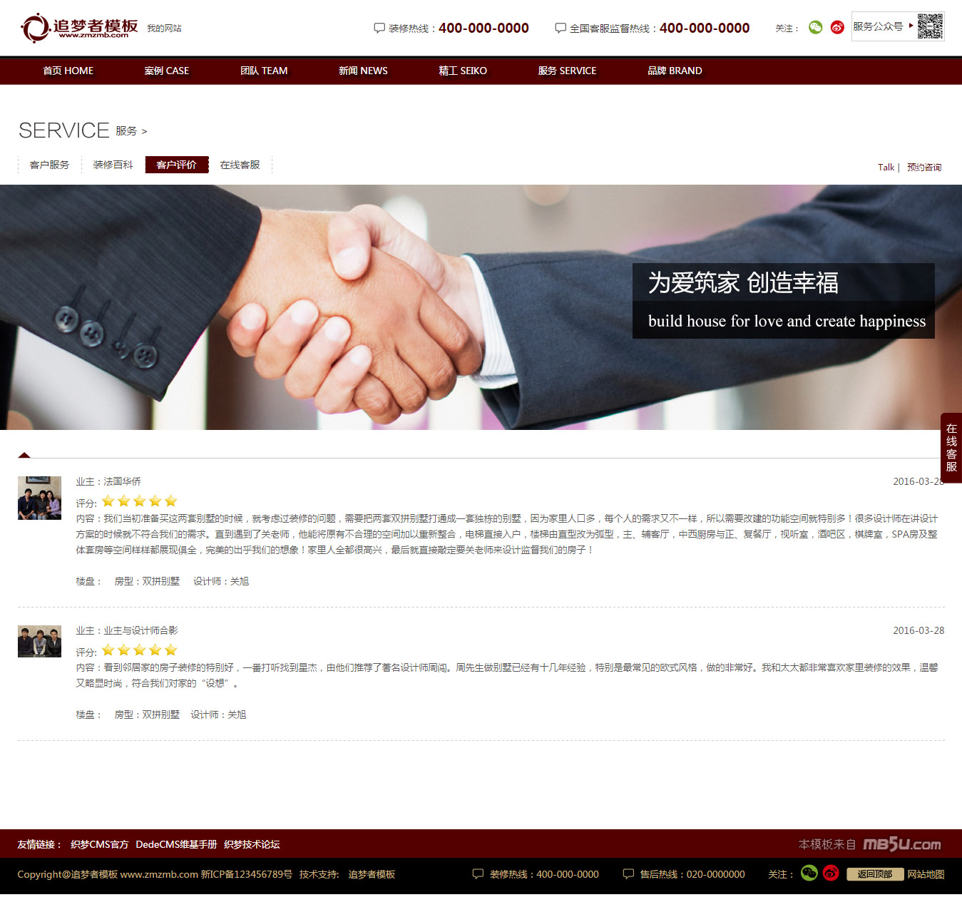 織夢CMS內核HTML5自適應裝飾裝修公司網站模板(支持移動設備) ,適合酒店設計,建筑,室內設計,裝飾等行業使用,測試完整無錯,兼容所有主流瀏覽器。本模板基于DEDE Cms 5.7 UTF-8設計,5.5以上的版本應該都能使用。如果需要GBK編碼版本請自行轉換編碼或聯系網站客服,如果不會安裝聯系網站客服協助。
