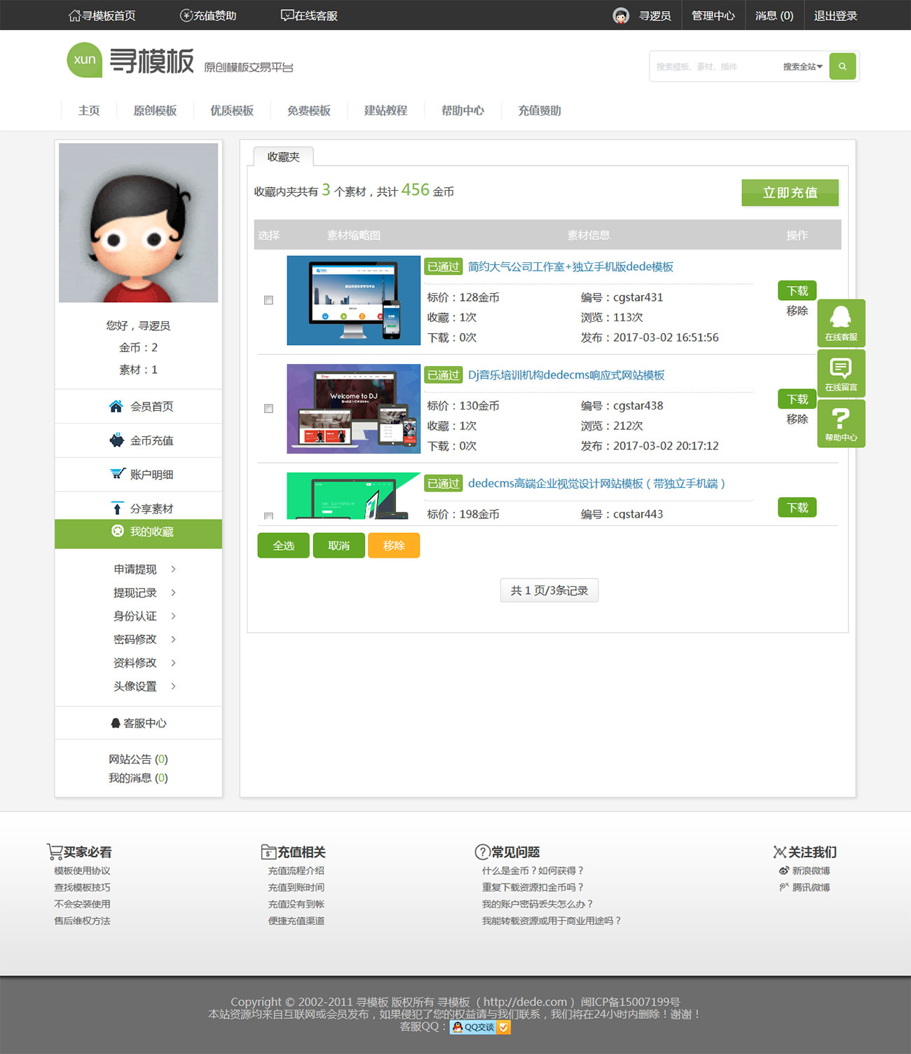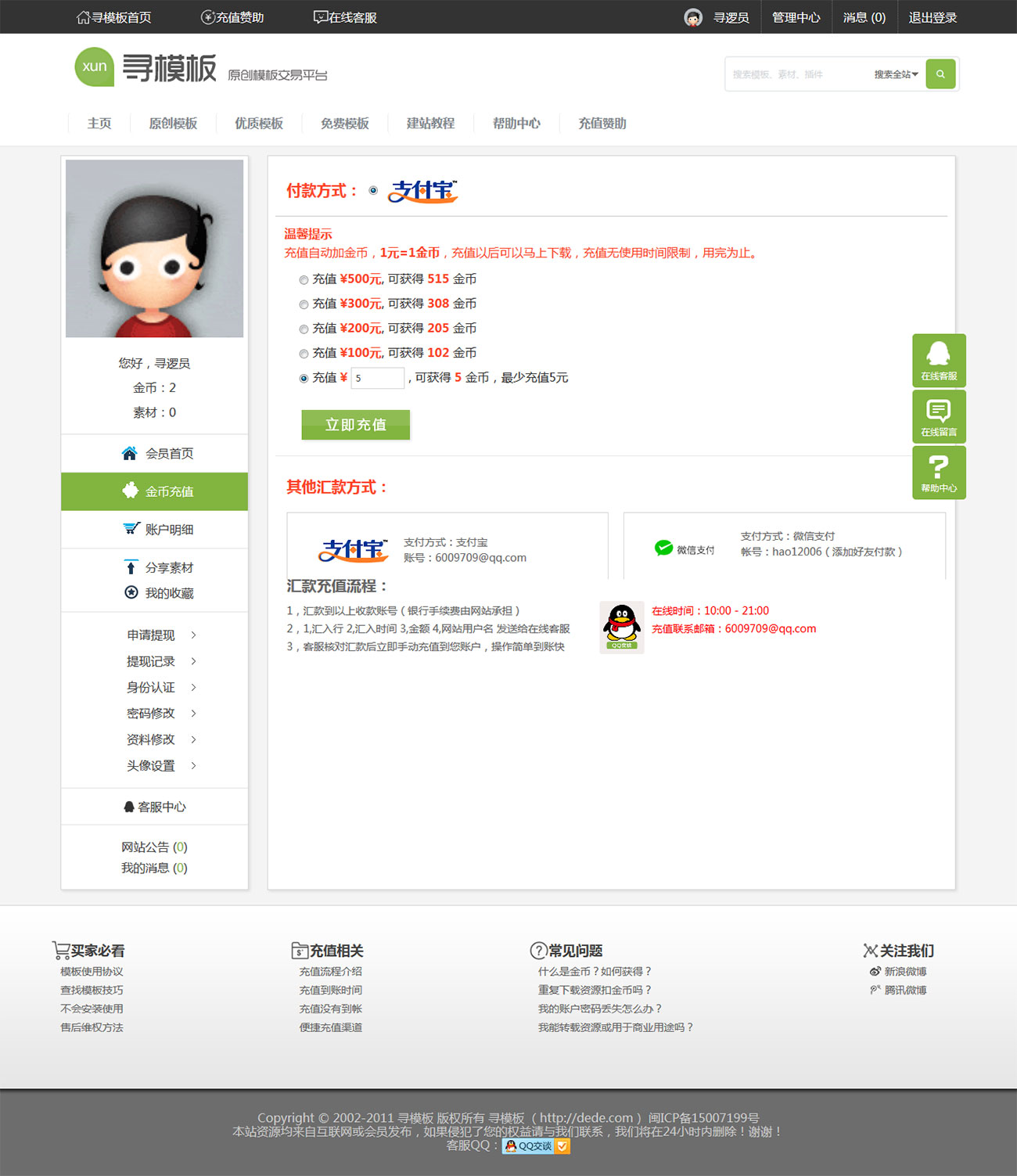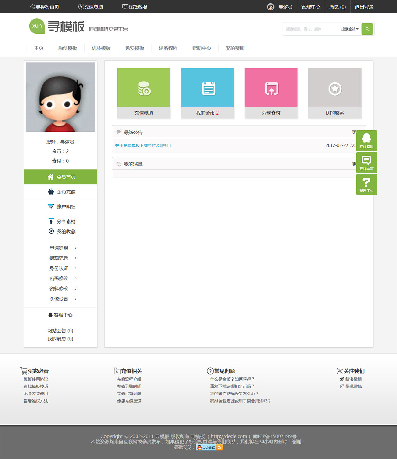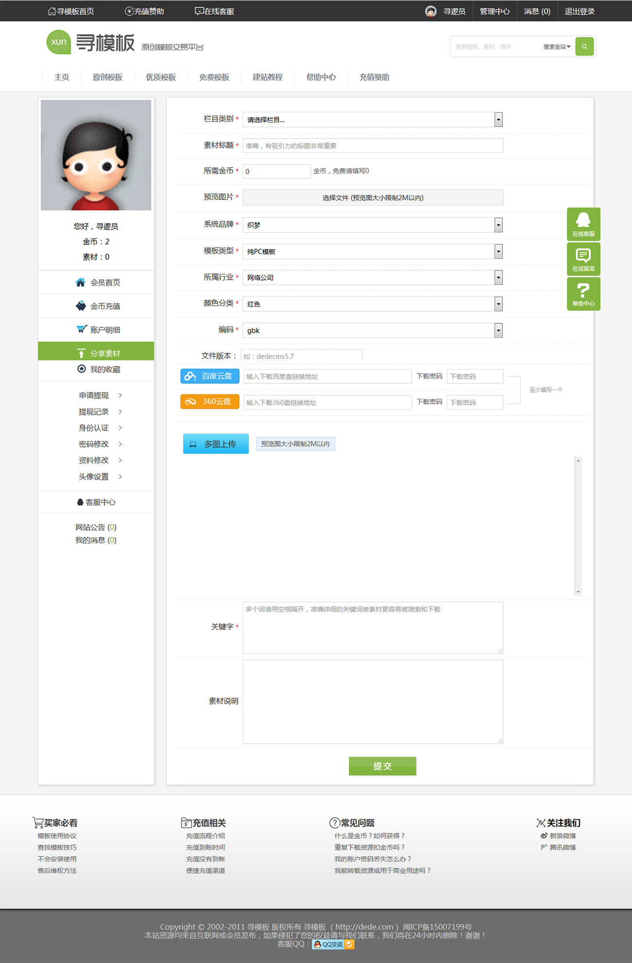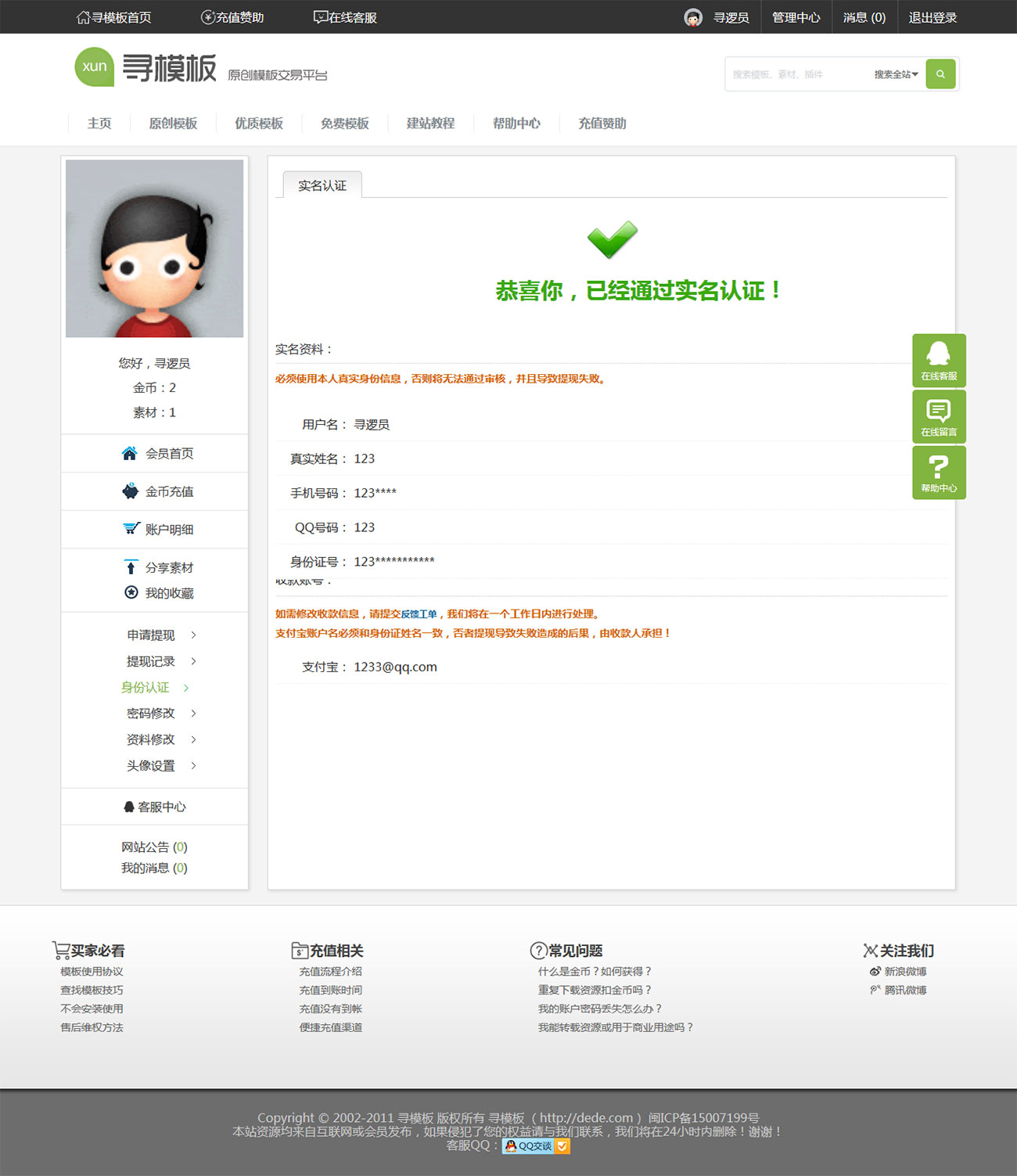 6.強大的會員功能:用戶中心(登錄、注冊、找回密碼、用戶中心首頁、金幣充值、作品發布、作品管理、收藏夾、資料修改、身份認證、申請提現等)