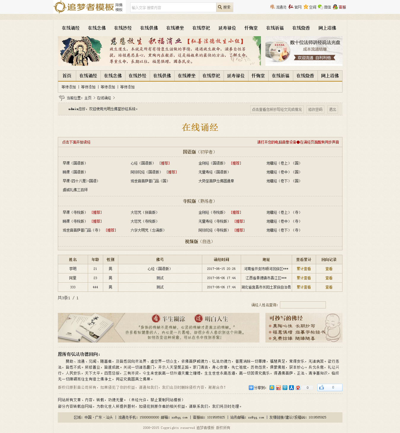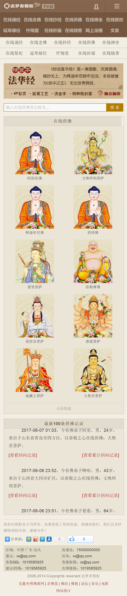 棕色宗教佛經類織夢模板(帶手機版)。適合宗教佛經行業,適用于網上進行拜佛活動等。整體布局大氣清晰干凈。帶會員中心,帶手機版,絕對是作者良心之作。模板附帶測試數據,帶安裝說明。包售后免費協助安裝調式。
