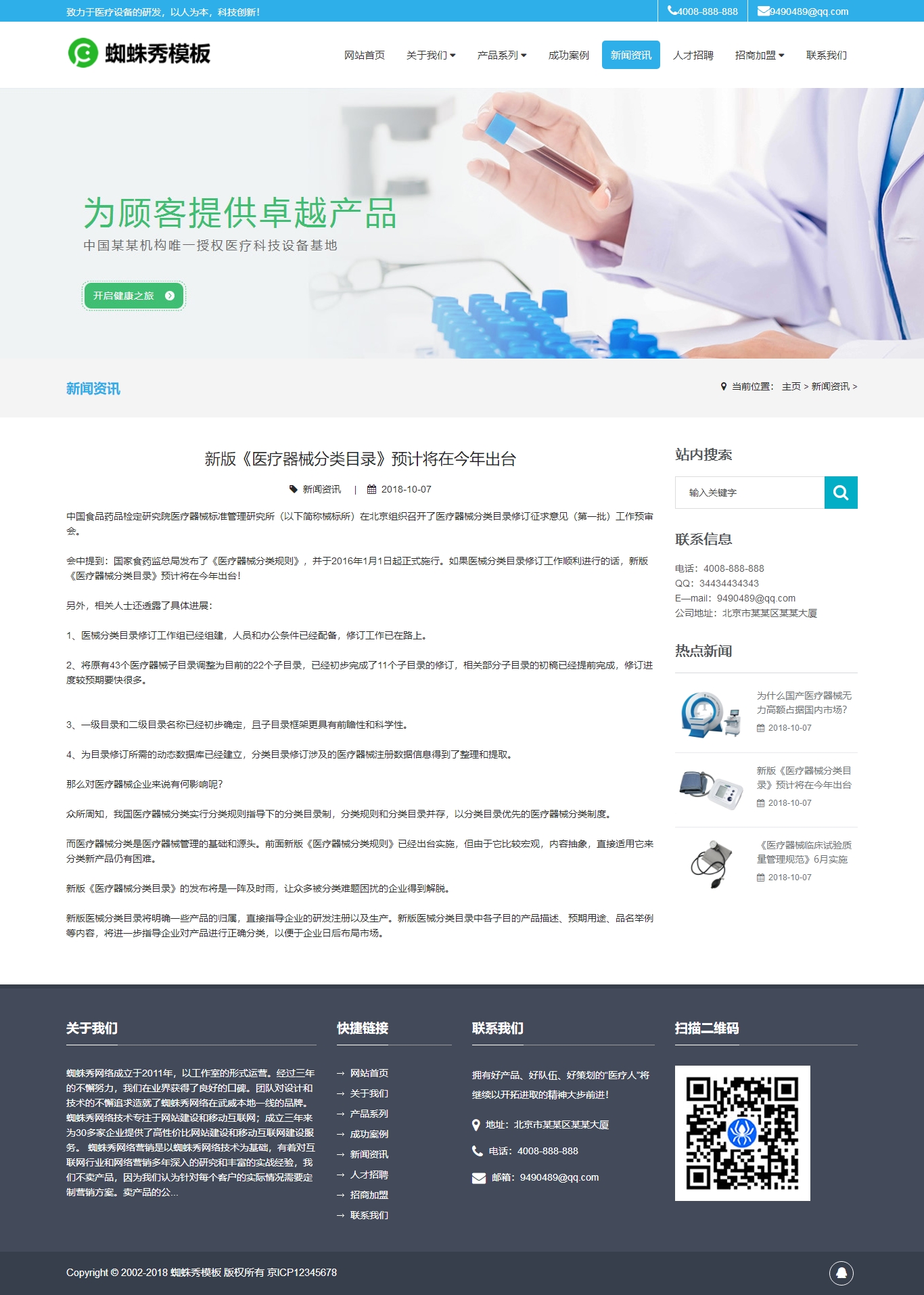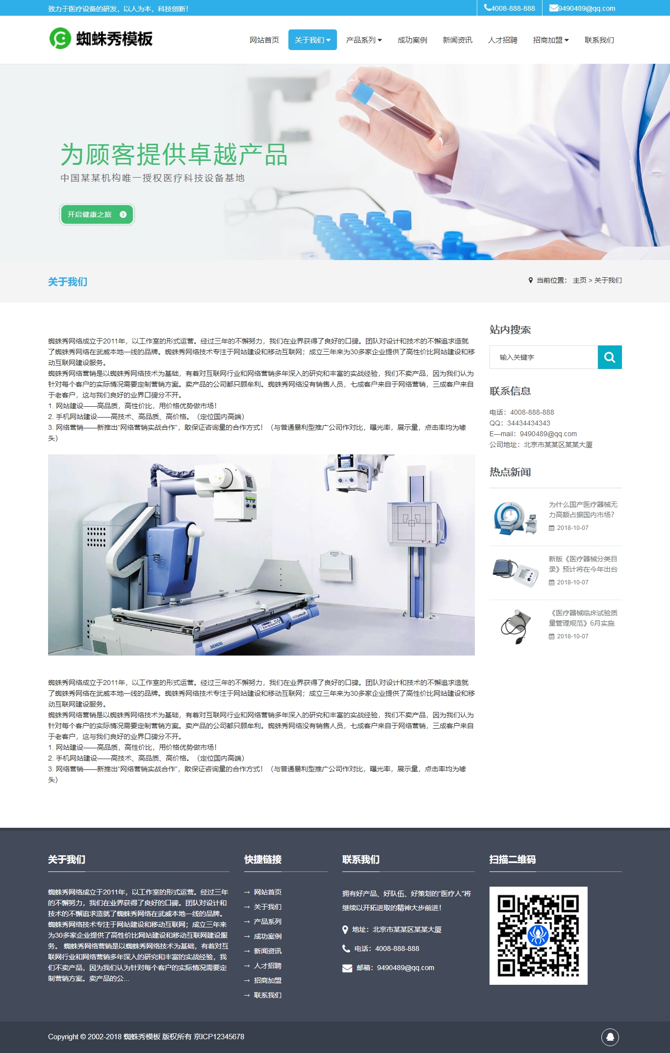 織夢內核開發的醫療器械,醫療設備,化學檢驗設備,工業設備,醫學設備類企業展示銷售模板,網站源碼非常簡介大氣,圖片展示效果非常突出,由織夢dede內核搭建,已經設置好欄目,各種JS特效都已實現,調用好數據,方便您使用。