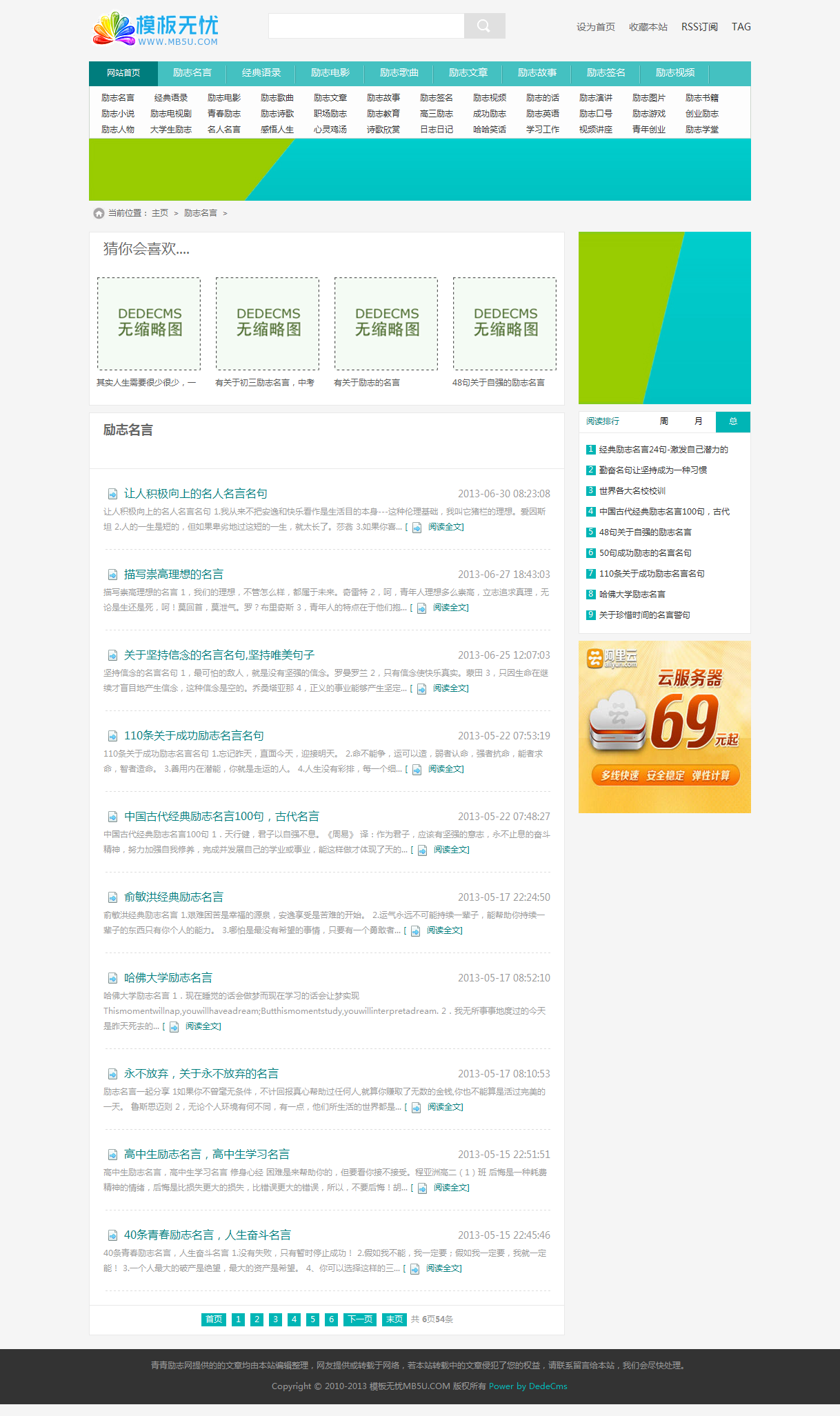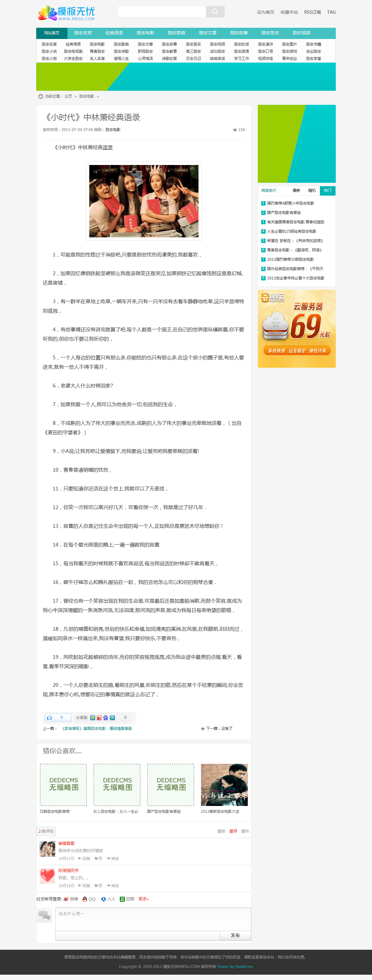 這款織夢模板使用最新DEDECMS5.7GBK制作的唯美句子美文類模板,是一款很不錯的文章發布類型的小清新dedecms模版,清新的淺藍色配色,好看而不失大方!測試完整無錯,兼容所有主流瀏覽器。