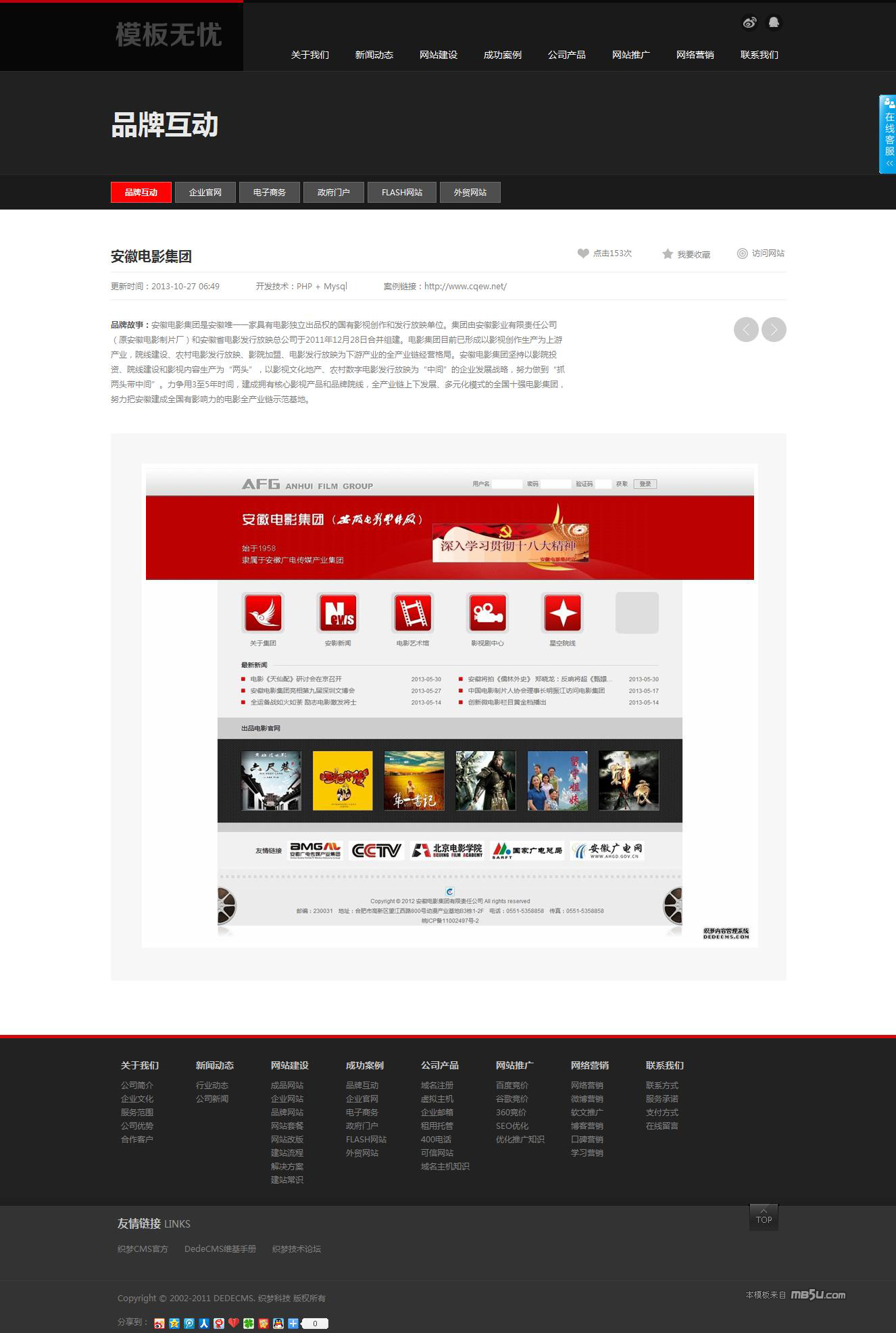 這模板是DEDECMS內(nèi)核的網(wǎng)站模板,整站以黑色為主,布局大氣。非常適合各類網(wǎng)站建設(shè)公司、網(wǎng)絡(luò)設(shè)計(jì)公司、廣告公司等工作室使用。帶在線客戶功能和在線留言功能。后臺可以直接操作查看客戶最新留言和客戶在線對話。作者精心制作,兼容所有主流瀏覽器。