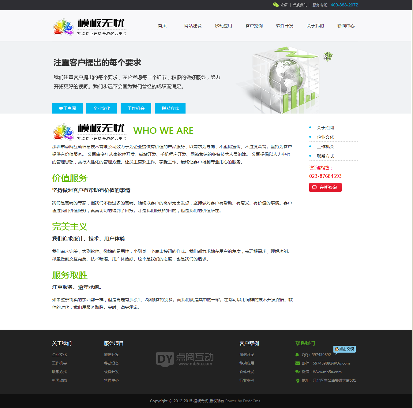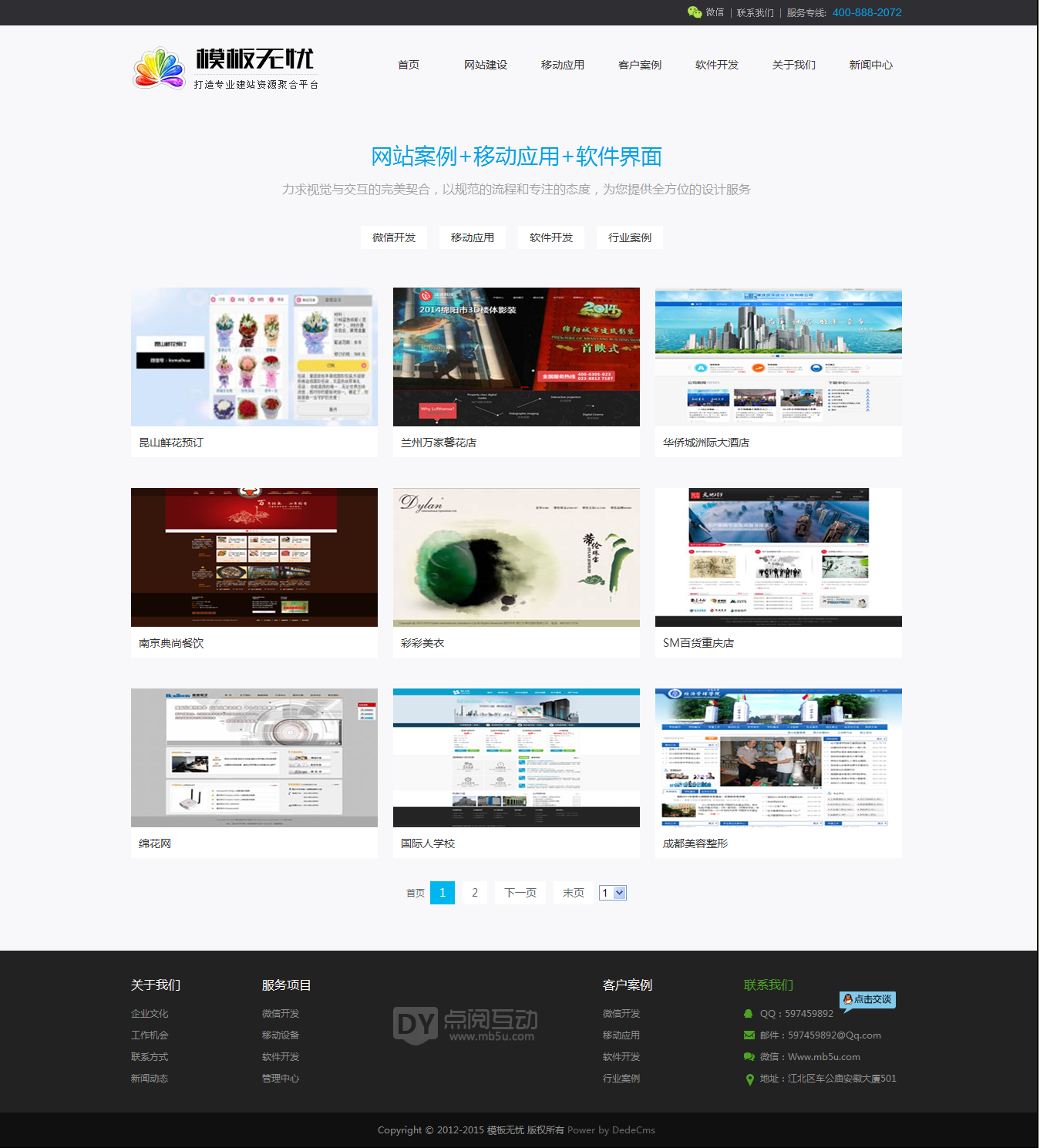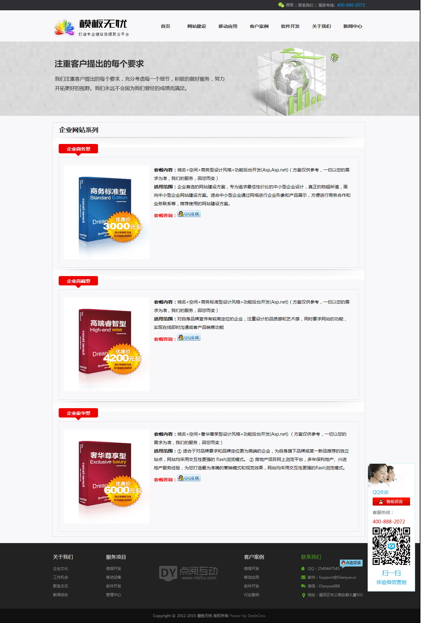 2014年最新微信營銷,網(wǎng)站建設(shè),軟件開發(fā)、UI設(shè)計(jì)類型工作室或者公司整站源碼,網(wǎng)站源碼非常簡介大氣,圖片展示效果非常突出,由織夢dede內(nèi)核搭建,已經(jīng)設(shè)置好欄目,各種JS特效都已實(shí)現(xiàn),調(diào)用好數(shù)據(jù),方便您使用。包括網(wǎng)站建設(shè),移動應(yīng)用,客戶案例,軟件開發(fā),關(guān)于我們,新聞中心等欄目。