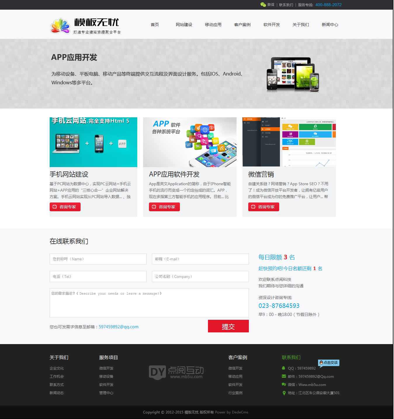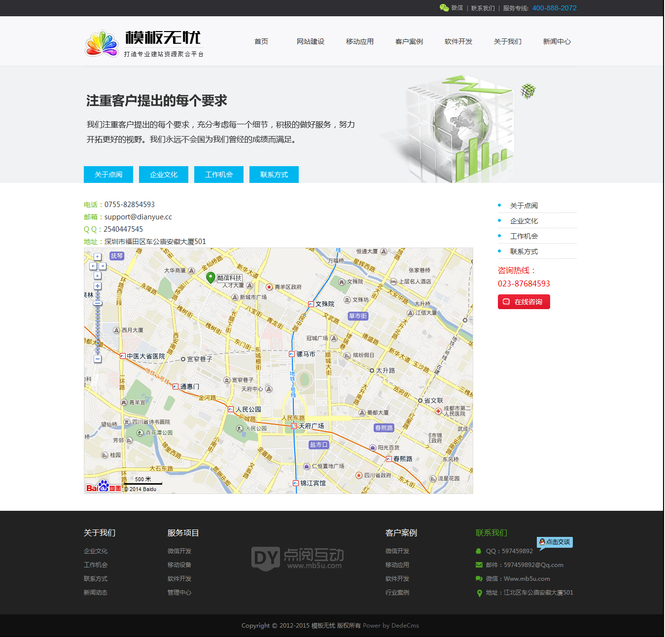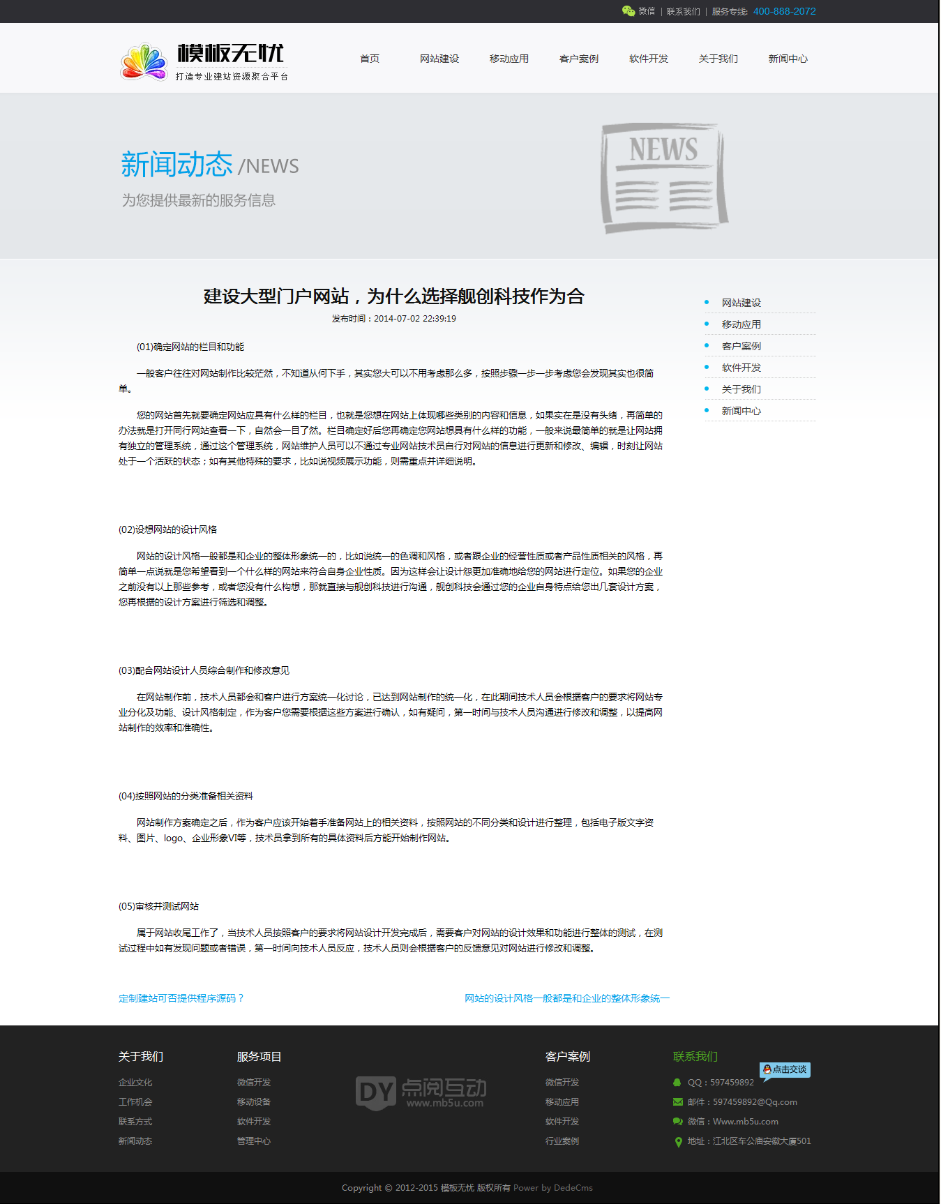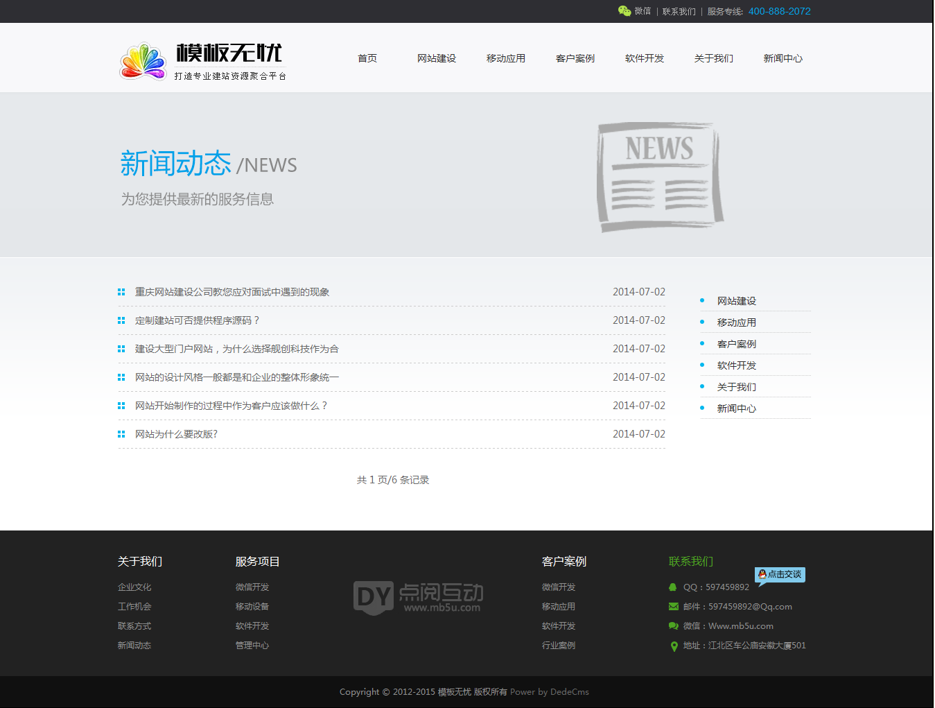2014年最新微信營銷,網(wǎng)站建設(shè),軟件開發(fā)、UI設(shè)計(jì)類型工作室或者公司整站源碼,網(wǎng)站源碼非常簡介大氣,圖片展示效果非常突出,由織夢dede內(nèi)核搭建,已經(jīng)設(shè)置好欄目,各種JS特效都已實(shí)現(xiàn),調(diào)用好數(shù)據(jù),方便您使用。包括網(wǎng)站建設(shè),移動應(yīng)用,客戶案例,軟件開發(fā),關(guān)于我們,新聞中心等欄目。
