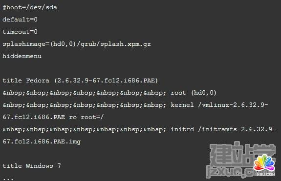 default - 默認(rèn)引導(dǎo)的菜單條目。在本例中,默認(rèn)引導(dǎo)第一個條目 Fedora (2.6.32.9-67.fc12.i686.PAE)。如果將 default 的值改成 1, 則會默認(rèn)引導(dǎo) Windows 7。