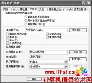 2.設置Wed服務器安裝好IIS后,還需要對其做一些簡單的設置。打開控制面板中的“管理工具→Internet信息服務”,然后在窗口左側依次打開“本地計算機→網站→默認網站”,在默認網站上點右鍵選屬性,打開“默認網站屬性”窗口。在“網站”標簽的“IP地址”中選擇“全部未分配”,其他項默認;選擇“主目錄”標簽, “連接到資源時的內容來源”單選項中選擇“此計算機上的目錄”,然后在“本地路徑”中指定主頁所在的位置(如圖2);打開“文檔”標簽,選中“啟用默認文檔”,然后單擊“添加”按鈕,輸入網站首頁名,一般是“index.htm”。