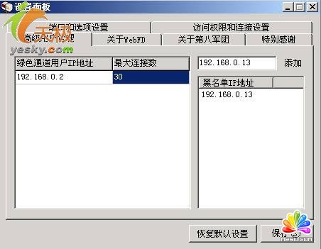 點(diǎn)擊“控制面板”按鈕進(jìn)入圖13的界面,選中“端口和選項(xiàng)設(shè)置”標(biāo)簽項(xiàng),勾選“每次都以后臺(tái)方式運(yùn)行在系統(tǒng)托盤(pán)區(qū)”、“每次開(kāi)機(jī)自動(dòng)運(yùn)行本程序”等復(fù)選框。而“服務(wù)端口”數(shù)值會(huì)出現(xiàn)在網(wǎng)站的地址中,你可以選擇系統(tǒng)默認(rèn);在“訪問(wèn)權(quán)限和連接設(shè)置”標(biāo)簽項(xiàng)(圖14)中設(shè)置“限制的連接速度”、“限制的連接人數(shù)”和“單個(gè)IP限制下載的文件數(shù)”等選項(xiàng);在“高級(jí)用戶(hù)管理”標(biāo)簽項(xiàng)(圖15)中設(shè)置“綠色通道用戶(hù)IP地址”和“最大連接數(shù)”,我是在本地機(jī)上建立自己的FTP 網(wǎng)站的,所以我在“綠色通道用戶(hù)IP地址”欄中輸入我的IP地址192.168.0.2,在“最大連接數(shù)”欄中輸入訪問(wèn)我的FTP網(wǎng)站的計(jì)算機(jī)數(shù)量為30臺(tái)。