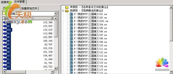 點(diǎn)擊“文件管理”標(biāo)簽項(xiàng)下的“瀏覽添加文件”按鈕(圖12),在下面的資源管理器中,選中自己想要加入的文件,直接拖放到右邊相應(yīng)的類(lèi)別下。如圖12中選中“F:\我的FTP站\三國(guó)演義\”下的所有rm文件,拖放到右邊的視頻類(lèi)下。當(dāng)然右邊框中的類(lèi)別目錄是可以通過(guò)單擊鼠標(biāo)右鍵在出現(xiàn)的快捷菜單中“新建”、“修改”和“刪除”命令來(lái)實(shí)現(xiàn)建立自己喜好類(lèi)別的目的。