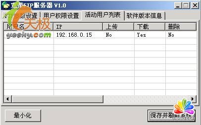 3、在“活動(dòng)用戶(hù)列表”項(xiàng)(圖9)中顯示的最近訪問(wèn)FTP服務(wù)器的用戶(hù)情況。最后將輸入的參數(shù)“保存并刷新系統(tǒng)”。