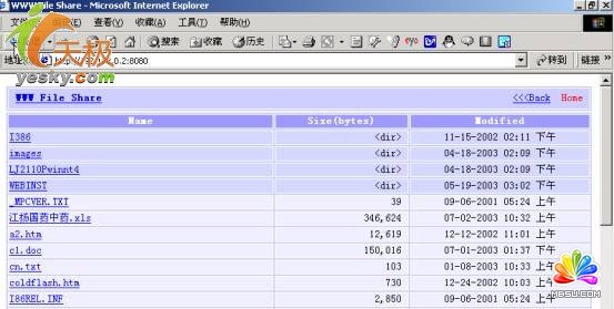 在別人的IE瀏覽器中輸入如圖1的“http://192.168.0.2:8080”,進(jìn)入圖6的下載界面。用戶(hù)可以用各種下載工具如網(wǎng)絡(luò)螞蟻、Net Transportt、FlashGet下載文件,象txt、word 、excel類(lèi)文檔鼠標(biāo)雙擊就能打開(kāi)。共享資源就是這么簡(jiǎn)單。