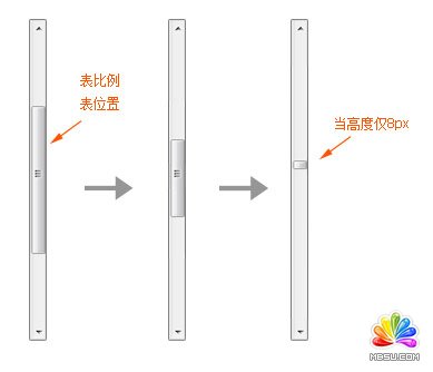 滾動(dòng)條可以理解為文檔在垂直方向上的縮略圖,滑塊可以表示可視區(qū)域當(dāng)前位置,可視區(qū)域占整體區(qū)域的比例。隨著文檔整體區(qū)域不斷增高,可視區(qū)域所占的比例越小,因此滑塊高度不斷變小。統(tǒng)計(jì)過(guò)IE、FF、Office等常用軟件,一般滑塊高度到8px時(shí)就不再縮小。當(dāng)滑塊高度只剩8px時(shí),滾動(dòng)條的拖動(dòng)體驗(yàn)就相當(dāng)?shù)牟睢?/p>