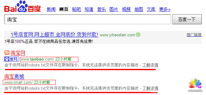 Robots.txt 直接屏蔽了百度,但是百度給予淘寶的快照都是每天更新的。這就說明了一切,淘寶有了品牌,百度必須要依靠品牌,不然百度損失慘重;如果淘寶沒有品牌,百度就會放棄你,你就會損失慘重。