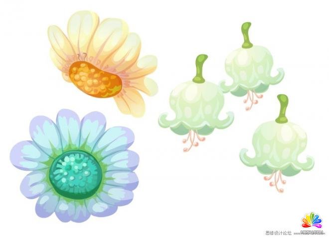 四 花花朵朵:花是畫面中的小亮點,所以顏色和質感都可以區別小龍和葉子,但是不要用太純的顏色,會覺得刺眼,破環整體畫面的柔和。