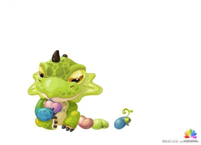三植物:植物的填充色和小龍基本一致,只是注意光源要和龍保持一個方向。由于小龍也是綠色的,所以在處理植物的時候有意識的去別一下,比如偏黃一點,或者橄欖綠。