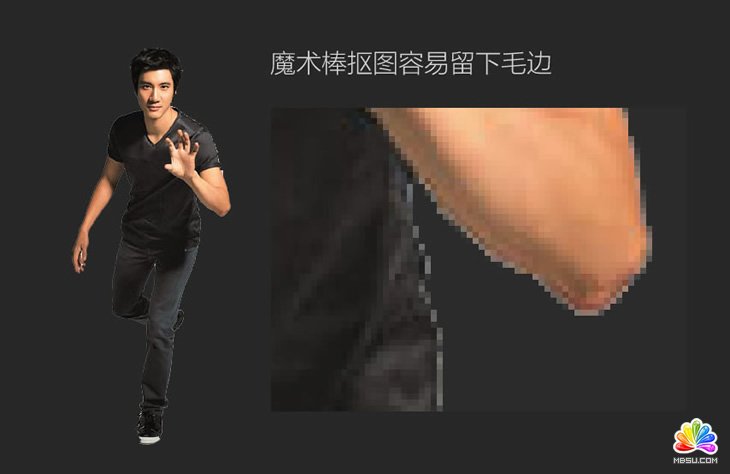 猜測設計人員做的時候應該是用的魔術棒摳圖的。魔術棒雖然好用摳圖很快,但是魔術棒摳出來的容易留下毛邊。