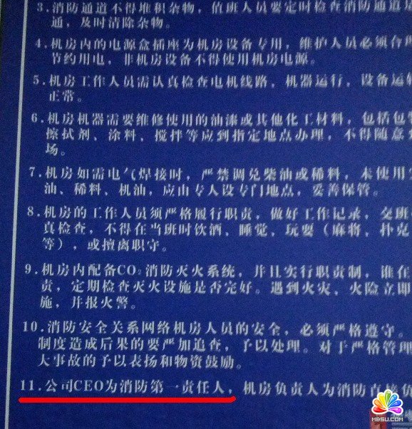 上圖是某用戶在機房拍的照片,我們可以看到警示語中11條所寫的內容 “公司CEO為消防第一責任人…… ” 敢問一句:你們負責了嗎?