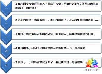 要通過搜索引擎進行營銷,企業必須了解搜索營銷的過程,而要了解營銷過程,首先要了解用戶是如何買東西的,我們以網上買蛋糕為例,看看用戶一般的網上購買過程。
