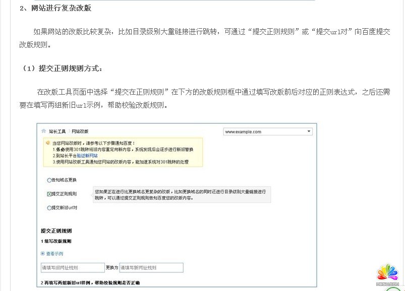 其次,網站進行復雜改版的時候,域名更換可以,但是要是能保持網站的title、關鍵詞、描述之類的能保留的盡量不要改動,雖然現在百度平臺發布了很多對于這塊改版的升級,但是個人覺得不到萬不得已,最好不要對于這些做出更改,畢竟搜索引擎對于熟悉的更有好感。但是由于升級改版工具,提交復雜改版域名的時候,我們就可以很好的利用提交正則規則方式了。畢竟大量目錄級別的鏈接跳轉是一個非常大的優勢。