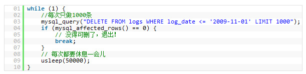 如果你需要在一個在線的網站上去執行一個大的DELETE或INSERT查詢,你需要非常小心,要避免你的操作讓你的整個網站停止相應。因為這兩個操作是會鎖表的,表一鎖住了,別的操作都進不來了。Apache會有很多的子進程或線程。所以,其工作起來相當有效率,而我們的服務器也希望有太多的子進程,線程和數據庫鏈接,這是極大的占服務器資源的事情,尤其是內存。如果你把你的表鎖上一段時間,比如30秒鐘,那么對于一個有很高訪問量的站點來說,這30秒所積累的訪問進程/線程,數據庫鏈接,打開的文件數,可能不僅僅會讓你泊WEB服務Crash,還可能會讓你的整臺服務器馬上掛了。所以,如果你有一個大的處理,你定你一定把其拆分,使用LIMIT條件是一個好的方法。下面是一個示例: