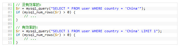下面的示例,只是為了找一下是否有“中國”的用戶,很明顯,后面的會比前面的更有效率。(請注意,第一條中是Select *,第二條是Select 1)