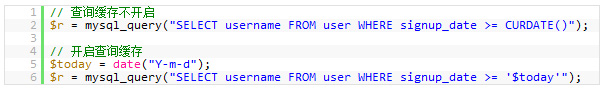 上面兩條SQL語句的差別就是CURDATE(),MySQL的查詢緩存對這個函數不起作用。所以,像NOW()和RAND()或是其它的諸如此類的SQL函數都不會開啟查詢緩存,因為這些函數的返回是會不定的易變的。所以,你所需要的就是用一個變量來代替MySQL的函數,從而開啟緩存。