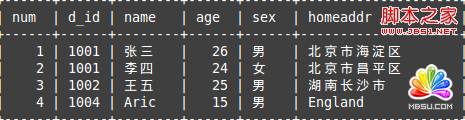 | 2 | 1001 | 李四 | 24 | 女 | 北京市昌平區 |