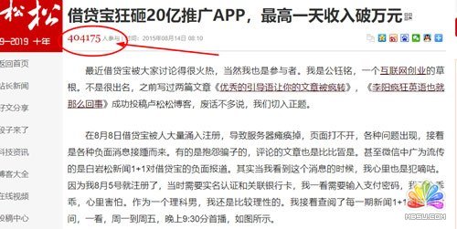 當時,我清晰的記得不少公司的推廣員,在百度搜索,“如何推廣借貸寶”,然后發現了松松博客上的一篇文章,可以查看下“借貸寶狂砸20億推廣APP,最高一天收入破萬元”這篇文章的地址。因為這個文章,讓我算是小賺了一筆,時間最短,卻實際上收益最大的,一筆財富,當然肯定比我賺的多的人,大有人在。