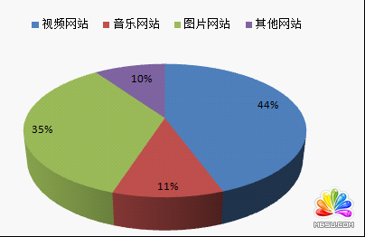 通過分析四月的分享數據,我們將網民所分享的頁面內容根據展現形式分為:視頻、音樂、圖片幾類,從不同類別下抽取200個網站的分享數據進行統計對比,得出如下結果: