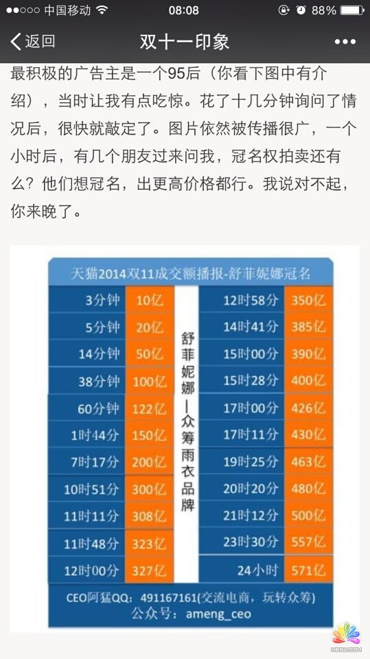 昨天,朋友圈里傳的最火的一條消息莫過于鬼腳七今年雙11的廣告被一個95后拍下了7W高價,竟然只是為了冠名一張鬼腳七當天在朋友圈滾動播報的一張雙11當天實時成交額播報圖!