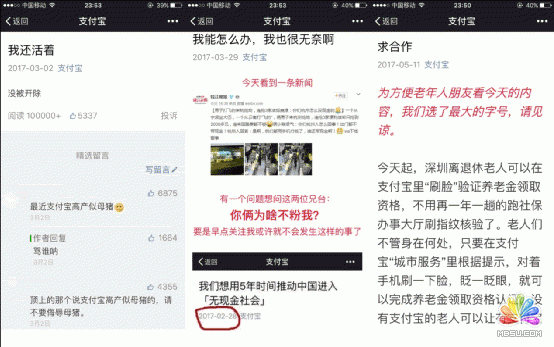 支付寶企業微信公眾號部分內容截圖